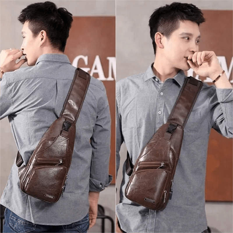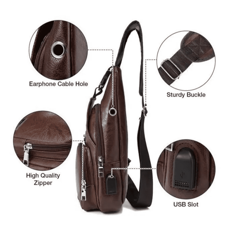 حقيبة صدر للرجال مزودة بمنفذ شحن USB حقيبة ريترو كروس بودي بو الجلود حقيبة الأعمال خمر الحقيبة للرياضة بني غامق حقيبة ظهر مضادة للسرقة مع منفذ شحن USB
