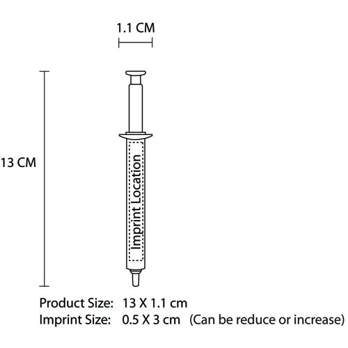 Designed with precision and style, the Syringe Ballpoint Pen is crafted with premium materials, measuring 13 x 1.1 x 0 cm, making it both sleek and functional. Its syringe shape is eye-catching and memorable, ensuring that your brand will be remembered long after the pen has been used.